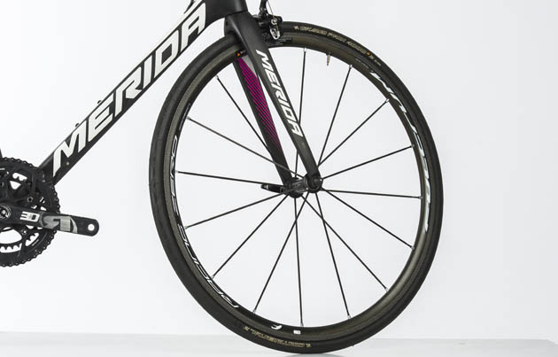 También es importante el empleo de fibras Nano Matrix, que gracias a las partículas que se intercalan en el entramado consiguen mayor resistencia, lo que permite reducir también el peso. No obstante, en algunas zonas el grosor del tubo es de apenas 0,7 mm. En Merida tampoco olvidan el factor comodidad y aun siendo una bici con genes de competición, y por tanto de sensaciones directas, no se hace pesada con el paso de los kilómetros. La culpa de su buena filtración de vibraciones la hemos de encontrar en las biofibras Flax de origen vegetal que se intercalan en el laminado de horquilla y tirantes.