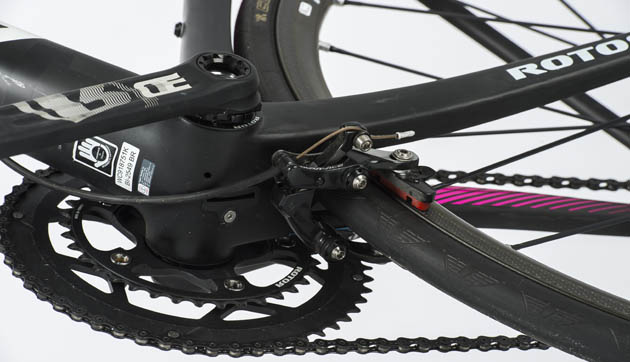 Aunque no terminan de ser del agrado de los usuarios, los frenos de anclaje directo bajo el pedalier tienen sus buenos argumentos y cuando se atiende correctamente a los requerimientos de rigidez de la zona, la diferencia con unos convencionales no se deja notar. En el caso de la Scultura se ha optado por esta solución, por un lado para favorecer la búsqueda de aerodinámica de la que antes hablábamos, y por otro para afinar al máximo los tirantes y lograr el necesario punto de absorción en una bici en la que se prima la rigidez. Cualidad esta, a nivel de pedalier, que es precisamente la responsable de que los frenos trabajen perfectamente en esta posición sin roces al ponerse de pie ni tacto chicloso.