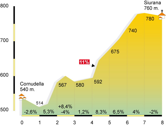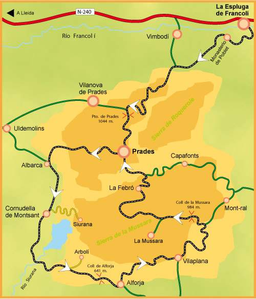 La pista forestal que asciende hacia este pueblo medieval hay que tomarla 600 metros antes de entrar en Cornudella del Montsant. Al principio desciende hasta cruzar un cauce pero, rápidamente, encontraremos rampas del 9% de pendiente que nos llevarán hasta un segundo cauce donde comienza la subida mantenida hasta Siurana. Entre el kilómetro 4 y 5 de ascensión hay dos muros consecutivos del 11% (llegan al 15% si tomamos las curvas por el interior) que coinciden con un estrecho barranco, donde veremos unos grandes muros de caliza roja donde es fácil encontrarnos con escaladores colgados de la pared. La pendiente desciende poco a poco hasta ganar un pequeño collado que coincide con el cruce de una pista de tierra que lleva hasta Prades. El tramo final es de suave descenso.