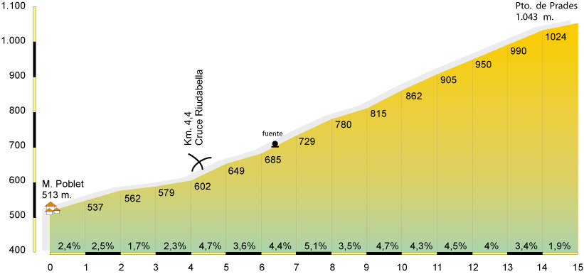 Es una subida muy cómoda que podemos realizar moviendo grandes desarrollos. Comenzamos la ascensión desde el mismo Monasterio de Poblet, por una carretera estrecha y bastante bacheada que, al principio, atraviesa un extenso viñedo hasta llegar al área de pic-nic donde comienza la verdadera subida al puerto. Se gana altura trazando tres curvas muy cerradas que nos permiten disponer siempre de una panorámica excelente de toda la Conca del Barberá. La parte final del puerto discurre entre un tupido pinar que nos protege del sol en los días más tórridos.