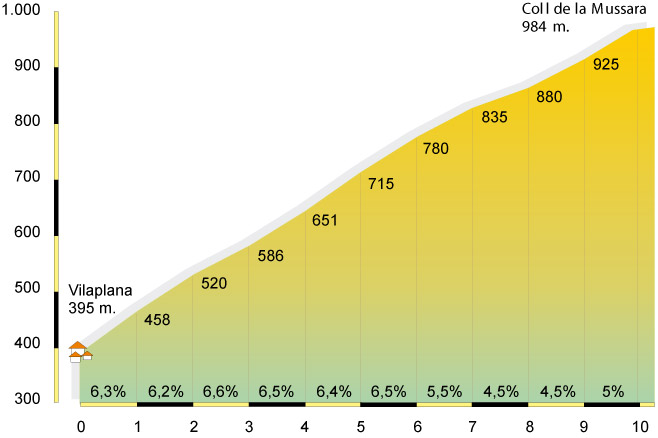 Lo más complicado de la Mussara son los 6 primeros kilómetros donde el desnivel no baja del 6% y encontramos rampas sueltas con el 8% de pendiente. Cuando entramos en la zona de curvas el porcentaje desciende, para incrementarse levemente en el kilómetro final, reconocible por la aparición de una gran antena.