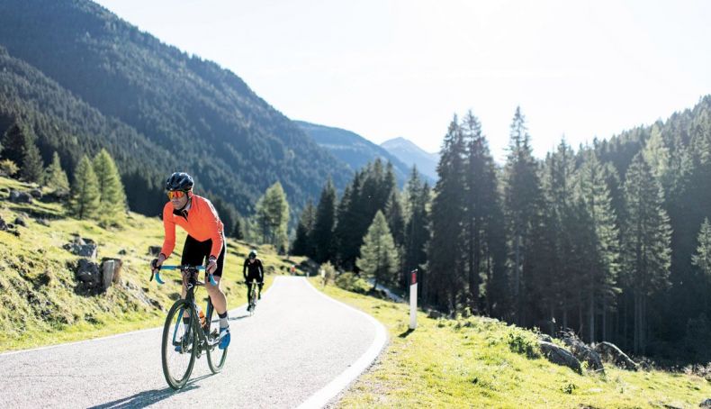 En la Sportful Dolimiti Race, el Manghen son 23 km al 7% de media; a nosotros nos bastó su segunda parte, eso sí, la más dura, con la pendiente siempre constante por encima del 9% y rozando el 10%, para hacernos una idea aproximada de lo duro que tiene que resultar. Arriba nos esperaban las primeras nieves de la temporada, caídas la noche anterior, que nos dejaron un paisaje espectacular, al igual que en el siguiente puerto, el Passo Rolle, una ascensión que quizás pierde atractivo por su menor dureza y por su amplia carretera, pero que en la cima nos regala una vista impactante del monte Cavalazza, pura escena dolomítica.