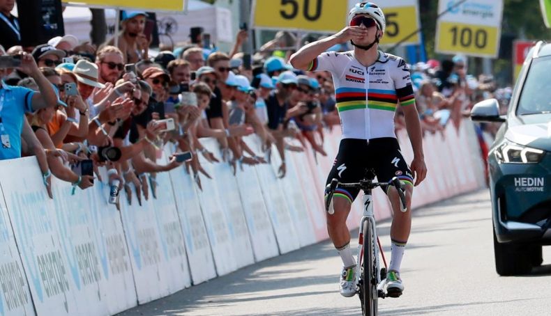 Qué más bonito que homenajear a Gino Mäder que con la imagen del campeón del mundo lanzando un beso al cielo y dedicándole el triunfo en la séptima etapa de la Vuelta a Suiza, que mantuvo el trazado de 183,5 kilómetros entre Tübach y Weinfelden, pero que modificó el lugar de la toma de tiempos para la general –se hizo a 25 km del final-, y eliminando las bonificaciones en los sprints intermedios y en meta.