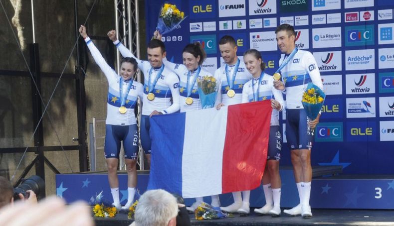 Con un equipo compuesto por Bruno Armirail, Rémi Cavagna, Thibault Guernalec, Juliette Labous, Cédrine Kerbaol y Marion Borras, Francia ha conquistado el oro en la contrarreloj mixta por equipos del Campeoanto de Europa que se está celebrando en el país galo, en concreto en la región de Drôme-Ardeche, en una prueba en la que Italia se ha llevado la medalla de plata (+7") y Suiza el bronce (+40").