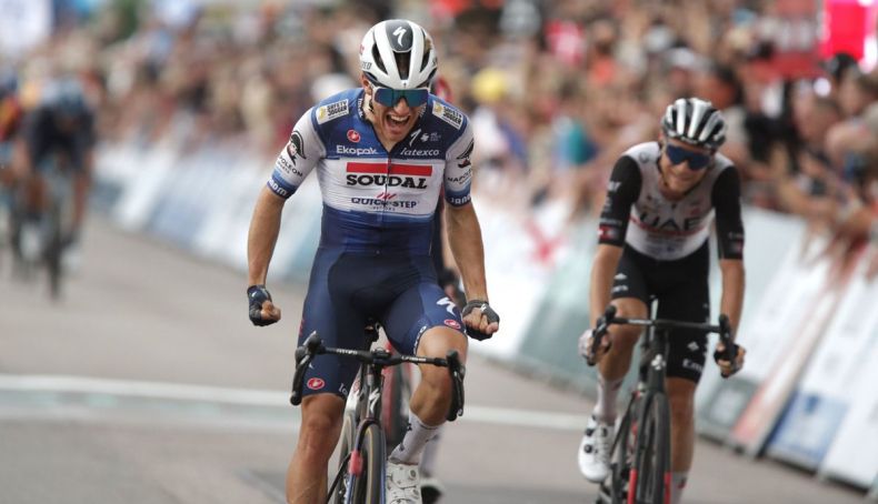Pisándoles los talones, a solo 3", llegaron Kevin Vermaeke, Pello Bilbao y Dylan Teuns, que cruzaron la meta por este orden, y a 10" el pelotón principal, de unas 40 unidades, en el que viajaba Ethan Vernon, primer maillot rojo de la prueba tras imponerse ayer en el prólogo de 2,3 km.