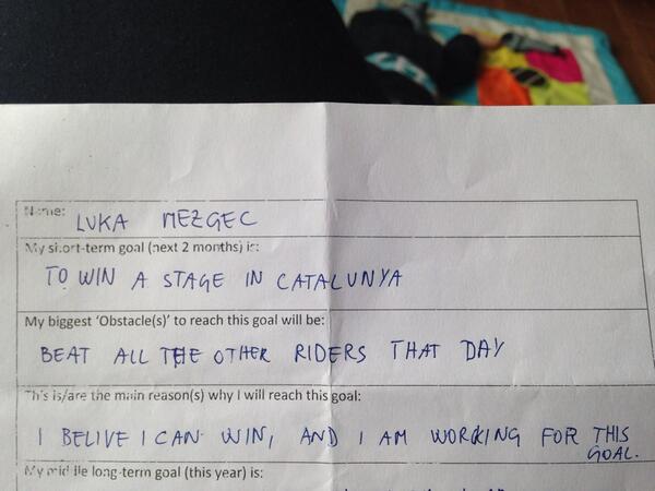 Horas después de anunciarse el triunfo de Luka Mezgec, comenzó a circular por las redes sociales la carta que aparece en la imagen, escrita por el sprinter esloveno durante la concentración en febrero que realizó el equipo Giant donde tenían que fijar los objetivos del inicio de temporada. “Ganar una etapa en Catalunya”. Dicho y hecho. No dejó pasar si quiera una oportunidad.