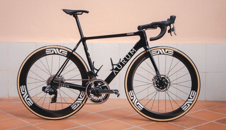 Para potenciar las cualidades del cuadro, la Aurum Magma Agate Black incorpora componentes de alta gama de la reconocida marca ENVE, incluyendo el manillar Compact, la tija Seatpost 400mm y la potencia Stem. Estos componentes aseguran un rendimiento de competición de primer nivel, combinando ligereza y seguridad. Además, la bicicleta utiliza el grupo SRAM RED eTap AXS, valorado por su precisión y eficiencia en los momentos más exigentes.