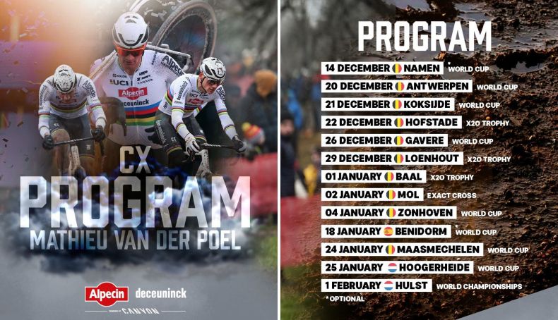 Here it is: the long-awaited cyclo-cross schedule for seven-time world champion @mathieuvdpoel. 13 races with the World Championships as the big finale!