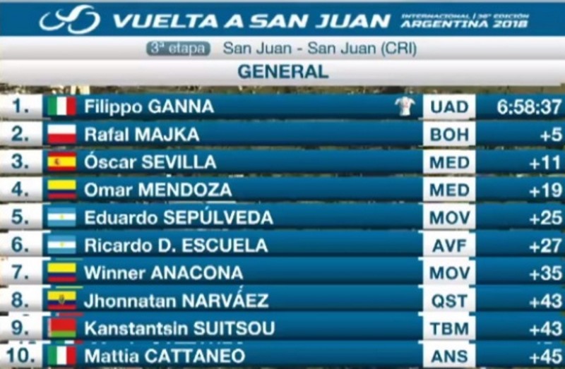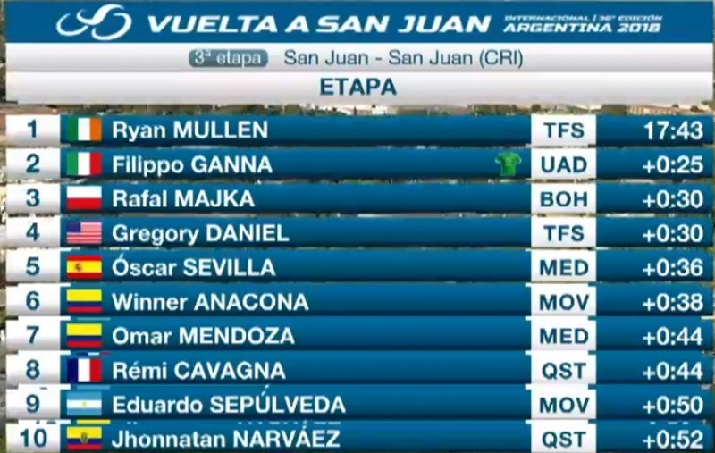 Mullen ha marcado un tiempo de 17’23’’, 25 segundos menos que Filippo Ganna, que se ha convertido en el nuevo líder de la Vuelta a San Juan. Tercero ha sido Rafal Majka. El polaco ya asoma en las posiciones cabeceras de la general. Ya es segundo a cinco segundos de Ganna. Por su parte, Óscar Sevilla realizó una notable contrarreloj, terminando quinto y ya ha ascendido hasta el tercer cajón de la general, a 11’’ del líder.
