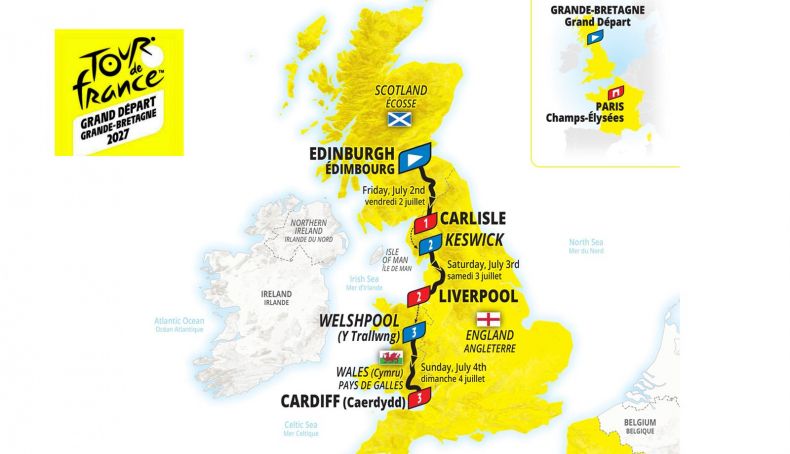 El Tour de Francia presentó este jueves los recorridos de las tres primeras etapas de su edición de 2027, que arrancará el viernes 2 de julio en el Reino Unido con una 'Grand Depart' que transitará por Escocia, Inglaterra y Gales (por primera vez, tres naciones albergarán las tres primeras etapas).