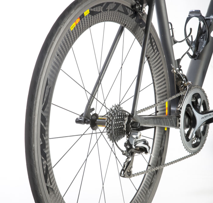 En cuanto a su construcción, la llanta de aluminio Maxtal aligerada y con soldadura SUP se une a un fino perfil de carbono 12K, al que en este caso no van anclados los radios -planos y conficados, 16 delante rectos y 20 detrás, a 2 cruces en el lado del piñón y rectos en el contrario-, esa labor recae sobre la llanta, por lo que para acceder a sus cabecillas tendremos que desmontar los perfiles aerodinámicos, la cubierta, cámara y el fondo de llanta. Los bujes son utilizados en otros modelos Cosmic, con flancos aerodinámicos, unidos mediante un cilindro de carbono y rodamientos sellados regulables con facilidad mediante una llave incluida.
