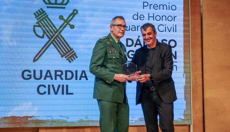 Fue el momento más emocionante de la "Gala de la Bici del Año" que organizamos en la tarde del pasado miércoles. El Premio de Honor 2023, un galardón muy especial este año, ha sido in memoriam para el Guardia Civil de Tráfico Dámaso Guillén, quien el pasado 2 de abril, en una carrera de cadetes en Asturias, dio su vida para detener la huida de un delincuente que con un coche robado se dirigía en dirección a un pelotón de jóvenes ciclistas. Un homenaje a su figura que se hizo extensivo a la Guardia Civil de Tráfico, cuya labor es imprescindible pàra el buen desarrollo de las carreras y marchas ciclistas. El Coronel Rafael Aparicio Azcárraga, Jefe del Área de Operaciones de la Agrupación de Tráfico de la Guardia Civil, recibió este emotivo reconocimiento de manos del director de La Vuelta Javier Guillén.