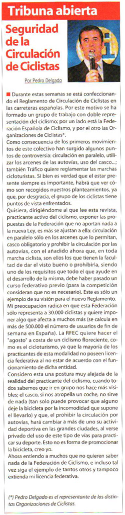 Corría el mes de abril de 2002. Se estaba negociando el Reglamento General de Circulación en el seno del GT-44 o de seguridad vial y ciclistas de la DGT. Pedro Delgado, como representante de Organizaciones Ciclistas, luchando para que el paralelo fuera aceptado sin fisuras, entre otras muchas medidas. También se estaba desarrollando el famoso Anexo II sobre marchas y competiciones. Y, tras varias reuniones en la que se citó a la Real Federación Española de Ciclismo, Pedro Delgado estalló y publicó el artículo que ahora podéis rememorar.