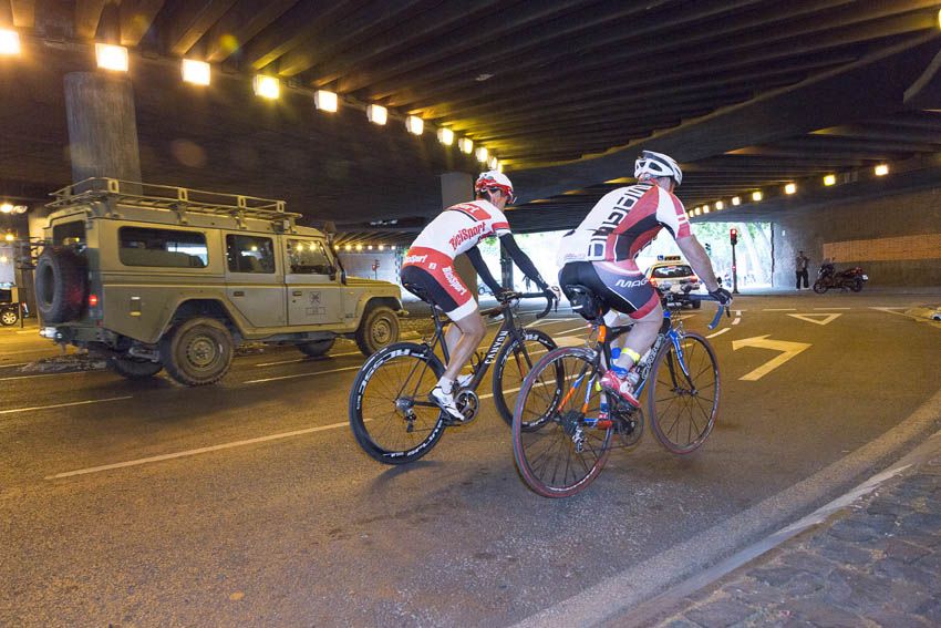 Por el centro del carril. Así controlaremos mejor los imprevistos, como el peatón de la foto que cruza la calzada justo cuando pasamos ¡Qué casualidad! Por lo menos nos ha visto.